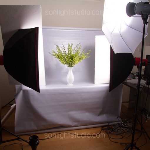 ในชุดที่จัด จะเป็นไฟสตูดิโอ 5ดวง และฉากไวนิลขาว ตามรูป ซึ่งมีไฟ 2ดวง อยู่ด้านหน้า ใส่ร่มทะลุ เพื่อต้องการให้สว่างทั่วๆ รูปทรงเงาสะท้อนในตา จะเป็นวงกลม 2ดวงไม่ขัดกัน ด้านข้างเยื่องไปทางด้านหลัง จะตั้งไฟยิงเข้าหาตัวนางแบบ เพื่อให้เกิดความสว่างที่ขอบผิว คล้ายออร่า และให้ภาพดูเป็นแนวทันสมัย ไฟอีก 1 ดวง ตั้งยิงฉากหลังให้ขาวสว่าง เพื่อให้ตัดกับตัวรูปทรงของนางแบบ ทำให้ ฝ่าย graphic สามารถไป ไดคัทภาพออกได้ง่าย หรือจะเอาภาพไปใช้ได้เลยก็ทำได้ง่าย
