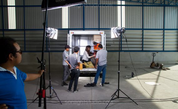 ลูกค้า เช่าไฟสตูดิโอ ถ่ายภาพ รถกระบะตู้ทึบ แคปกระบะ พร้อมชั้นวางสินค้าข้างในตู้ โดยถ่ายทั้งข้างนอก และข้างในตู้ทึบ เพื่อให้เห็นรายละเอียดตัวรถ และฟังค์ชั่น การใช้งานที่มีให้ทุกส่วน ภาพที่ได้ ต้องนำไปไดคัท ตัดฉากหลังออก เพื่อเอาเฉพาะรูปตัวรถ ไปใช้ในสื่อโฆษณา โบรชัวร์ แคตตล๊อกสินค้า รวมถึงใช้ใน facebook และเว็บไซท์ ออนไลน์ ทำไมต้องใช้ไฟสตูดิโอ 4ดวง ? เพราะว่าตัว รถกระบะตู้ทึบ มีขนาดที่ใหญ่ เมื่อเทียบกับ การถ่ายรูปสินค้าปกติ ดังนั้น หากต้องการให้ ตัวรถมีความสว่าง ทวดเกือบทุกจุดมากที่สุด ก็ต้องใช้ไฟจำนวนดวงมากขึ้น ซึ่งจากการวางแผน ถึงรูปแบบการจัดไฟ ลูกค้าก็ตกลงว่า จะเลือก เช่าไฟสตูดิโอ จำนวน 4 ดวง โดยมุมภาพที่ใหญ่ที่สุด คาดว่าต้องใช้ ไฟสตูดิโอทั้งหมด คือมุมภาพแนวเฉียงของรถ หันหน้ามาทางขวา โดยที่จะต้องใช้ไฟสตูดิโอดวงที่1 ตั้งด้านขวาสุด ยิงแสงแฟลชไปที่หน้ารถ ไฟสตูดิโอดวงที่ 2 ตั้งตรงกลาง ยิงไปยังประตูด้านคนขับ ไฟดวงที่ 3 ตั้งด้านท้าย ยิงไปยังตัวแคปด้านนอก ดวงที่ 4 ยิงแสงไปที่ใต้ท้องรถ ซึ่งรูปแนวเฉียงลักษณะนี้ จะมีด้วยกัน 4 มุม รอบรถ แต่ในมุมภาพอื่นๆ ก็ต้องใช้ ไฟสตูดิโอ จำนวนไม่น้อยกว่าสามดวงขึ้นไป เหมือนกัน ไม่ว่าจะเป็นด้านหน้าตรงของรถหรือ ด้านหลังกระบะที่เปิดตู้ทึบ ไม่มีฉากขาวด้านหลัง จะต้องไดคัทอย่างไร ? การถ่ายภาพ รถกระบะตู้ทึบ อันนี้ จะเป็นการไปถ่ายที่โรงงานที่ผลิต ดังนั้นสภาพโดยทั่วไปของโรงงาน จะไม่ได้เหมาะต่อการถ่ายรูป เหมือนในการถ่ายในสตูดิโอ ดังนั้นเป้าหมายหลัก ที่ช่างภาพต้องการ ก็คือ แสงจากไฟสตูดิโอจะต้องช่วยทำให้ ตัวรถ มีความสวย เห็นรายละเอียดชัดเจน รวมถึงจะต้องทำให้สามารถ แยกภาพตัวรถ จากภาพพื้นที่ในโรงงาน ออกมาให้ได้ ไม่ว่าจะเป็น แยกจากพื้นหรือแยกจากผนัง เพื่อให้ช่างภาพสามารถ ไดคัทส่วนอื่นๆนอกเหนือจากตัวรถออกไปได้ ตัวรถกระบะ และส่วนตู้แคปกระบะ เป็นส่วนที่มีสีขาว แต่ตรงล้อยาง และกระจกหน้า เป็นส่วนที่มีสีดำ สภาพพื้นที่ในโรงงาน จะเป็นกำแพงสีเทาหรือขาว ตรงพื้นใต้ท้องรถ จะเป็นสีดำจากเงาของรถเอง การแยก ส่วนที่เป็นสีขาว จะ หนังที่เป็นสีอ่อนเหมือนกัน จะใช้วิธี จอดรถ ห่างจากผนัง เว้นระยะ มากกว่า 3 เมตร เพื่อที่ว่า เมื่อไฟสตูดิโอ ยิงเข้าไปหารถเพื่อเพิ่มความสว่าง ความสว่างของไฟจะลดลงตามระยะทาง และไม่เพียงพอ ที่จะไปทำให้ ผนังสว่างขึ้น ช่างภาพก็จะได้ภาพ ที่เห็นตัวรถ สว่าง แต่ด้านหลังเป็นสี ที่มืดกว่า ก็จะสามารถ ตัวรถออกจาก หลังได้แล้ว ในส่วนล้อ ที่มีสีดำ และใต้ท้องรถที่เป็นเ