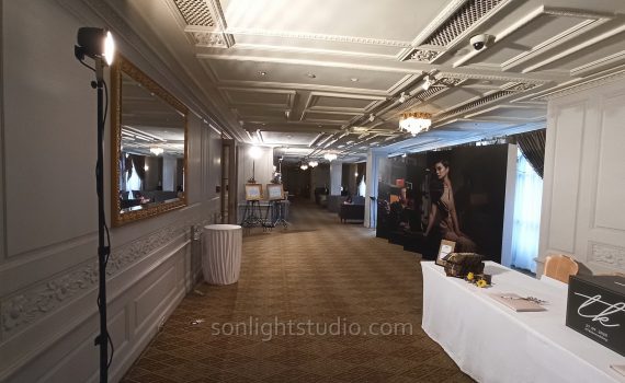 เช่าไฟงานแต่ง ไฟสปอร์ตไลท์ งานแต่งงาน โดยเป็นงานพิธีช่วงเช้า แล้วมีการกินเลี้ยง ช่วงตอนเที่ยง ที่ห้องบอลรูม โดยเน้น วางไฟ เพิ่มความสว่าง ตามจุดต่างๆหน้างาน เช่น ทางเดินก่อนเข้าห้องจัดเลี้ยง บริเวณหน้า รูปแกลเลอรี่ขนาดใหญ่ Photo Box ที่อยู่หน้าห้องจัดเลี้ยง เนื่องจาก ในโรงแรม โอเรียนเต็ล เป็นโรงแรมที่ ภายในสวยมาก มีไฟประตับในจุดต่างๆมากมาย สวยงาม ซึ่งทั้งหมด จะเป็นไฟ สีวอร์มเหลือง ดังนั้น ไฟสปอร์ตไลท์ ที่ใช้ส่องสว่าง ก็เลยใช้ไฟที่มี สีวอร์มเหลืองเหมือนกัน ก็ เลยจะเป็น ไฟสปอร์ตไลท์ หลอดฮาโลเจน 1000w แสงวอร์ม ทำไมต้อง เช่าไฟงานแต่ง เป็น ไฟสปอร์ตไลท์ 1000w ใน งานแต่งงาน ? ประเด็นแรก ในโรงแรมโอเรียนเต็ล เป็นโรงแรมที่มี การตกแต่งภายใน ที่สวยงามมากๆ แสดงถึงความเป็นไทย มีโคมระย้า มีระเบียงที่เป็นไม้ มีไฟตกแต่ง ตามจุดต่างๆ ทั้งเพดาน และผนัง เป็นสีวอร์มส้ม ดังนั้น เมื่อต้องการใช้ ไฟส่องสว่าง ในพื้นที่บริเวณหน้างานแต่งงาน ทางเราจึงแนะนำให้ใช้เป็น ไฟสปอร์ตไลท์ หลอดฮาโลเจน 1000 วัตต์ ซึ่งจะเป็น แสงสีวอร์มส้ม แบบเดียวกันกับ ไฟตกแต่งในโรงแรม เมื่อแสงเป็นไปในทิศทางเดียวกัน แบบเดียวกัน ก็จะทำให้ดู ไม่ขัดแย้งกันเกินไป และส่วนสำคัญก็คือ เมื่อมีการถ่ายภาพนิ่ง หรือถ่ายภาพวีดีโอ การที่มี โทนแสงสีเดียวกันทั้งภาพ ทำให้การปรับแต่ง white balance ในภาพ ทำได้ง่ายกว่าภาพ ที่มีทั้งไฟสีขาว และไฟสีส้มในภาพเดียวกัน ประเด็นที่ 2 ไฟสปอร์ตไลท์ หลอดฮาโลเจน 1000 วัตต์ เป็นไฟที่มีกำลัง ความสว่างสูงมาก ประมาณ 30,000 ลูเมน ต่อไฟ 1 ดวง ซึ่งสว่างได้เทียบเท่า กับไฟเมทัลฮาไลด์ ขนาด 400 วัตต์ ที่ใช้ส่องภายนอกอาคาร หรือเทียบเท่ากับ LED สปอร์ตไลท์ ขนาด 200 วัตต์ แต่ไฟทั้ง 2 แบบนั้น จะมีขนาดที่ใหญ่ และน้ำหนักที่หนักมาก โดยที่ไฟสปอร์ตไลท์ หลอดฮาโลเจน 1000 วัตต์ จะมีขนาดเล็กเพียงแค่ ฝ่ามือของคนปกติ รวมทั้งมีน้ำหนักเบา สามารถเคลื่อนย้ายได้ง่าย เมื่อติดตั้ง ก็จะไม่กินพื้นที่ภายในงาน ประเด็นที่ 3 ตัวไฟสปอร์ตไลท์ หลอดฮาโลเจน 1000 วัตต์ ในชุดที่ทางร้านมีให้บริการ จะเป็นชุดที่ มี 4 ดวงมาพร้อมกัน ซึ่งจะสะดวกมาก หาพื้นที่งานแต่งงาน มีบริเวณกิจกรรม หลายจุด อย่างเช่นในงานนี้ จะมีโซนที่เป็น Backdrop ถ่ายรูปหลัก อยู่ตรงบันไดทางขึ้นห้องงาน ทางเราก็ติดตั้งตัวไฟสปอร์ตไลท์ ไว้ 2 ดวง ตั้งด้านซ้ายและขวาสุด หัน 45 องศา ส่องเข้าไปหาตรงกลาง Backdrop เพื่อให้สามารถที่จะ ถ่ายภาพนิ่ง หรือถ่ายวีดีโอ บ่าวสาว กับแขกที่มาร่วมงาน ได้ภาพแบบ ความละเอียดสูง พื้นที่นึง บริเวณ เป็นจุดโต๊ะลงทะเบียน และจุดที่เป็น รูปภา